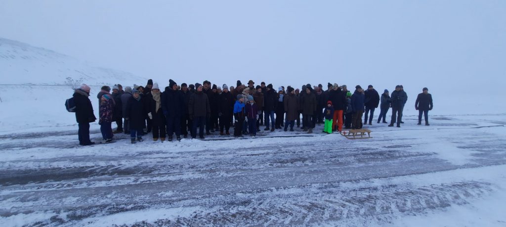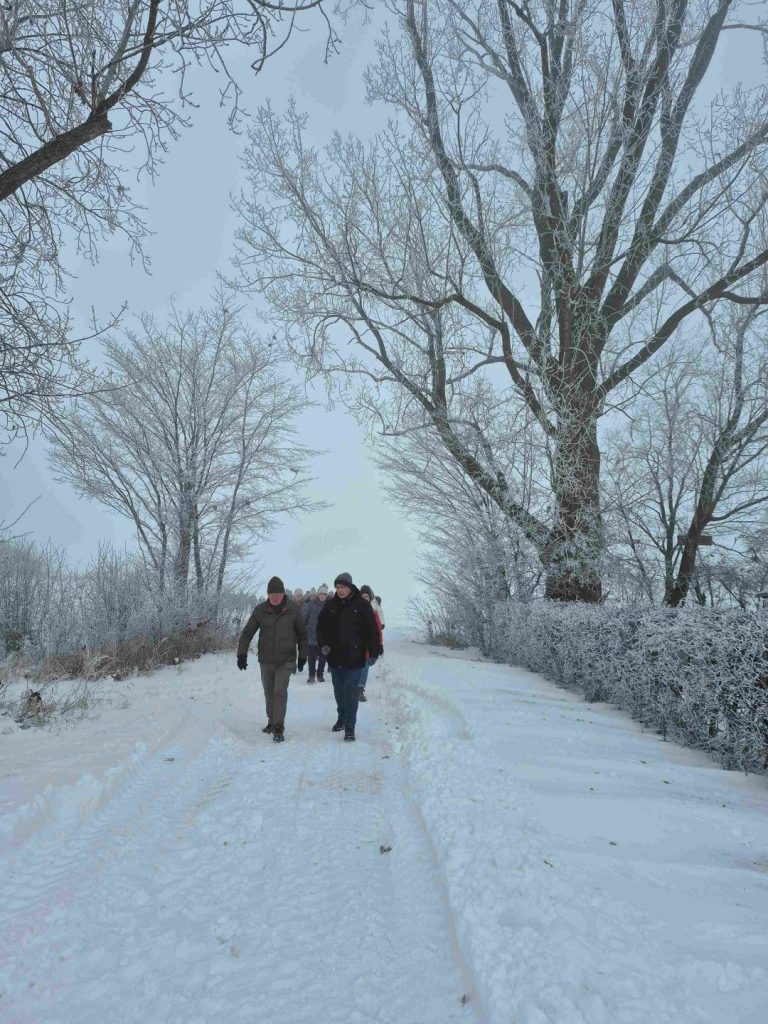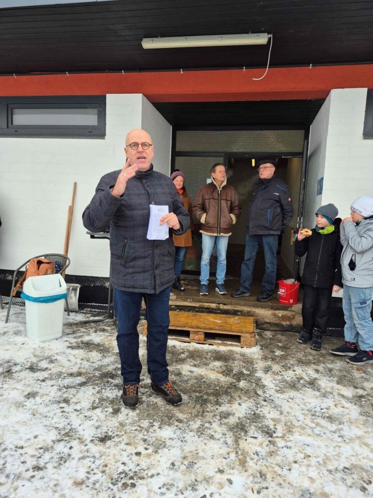 Am Sonntagmorgen zeigte sich das Wetter zunächst noch neblig, der Wind ließ jedoch nach und später kam sogar die Sonne zum Vorschein. Viele Teilnehmende fanden sich bereits um 10 Uhr zur Wanderung ein und stimmten für die gewohnte Runde. Eine Station wurde an der Waage der Biogasanlage eingelegt – mit einem beachtlichen Ergebnis: Gemeinsam brachten es alle Teilnehmenden auf 5,340 Tonnen und überschritten damit deutlich die 5-Tonnen-Marke. Anschließend ging es weiter durch Schneewehen in der Senke, wo das Gleichgewichthalten nicht immer einfach war. Die Kinder genossen die winterliche Landschaft teilweise auf dem Schlitten. Trotz der Anstrengungen wurde allen schnell warm.